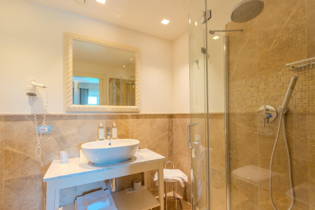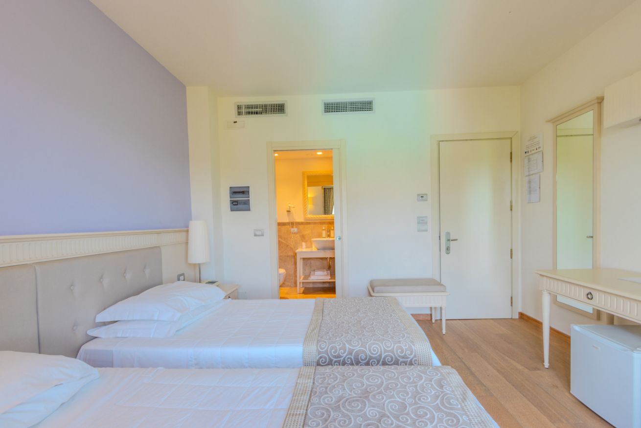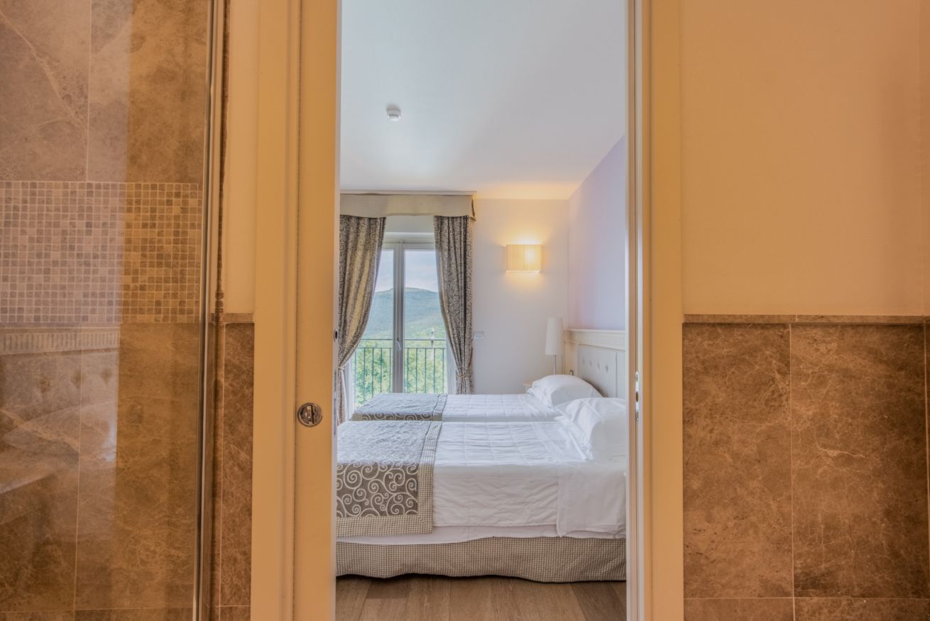 Das 19 m² große Doppelzimmer besteht aus einem Schlafzimmer mit Doppelbett (auf Anfrage auch als zwei Einzelbetten verfügbar) und einem eleganten, privaten Marmorbad mit kompletter Ausstattung und Dusche.