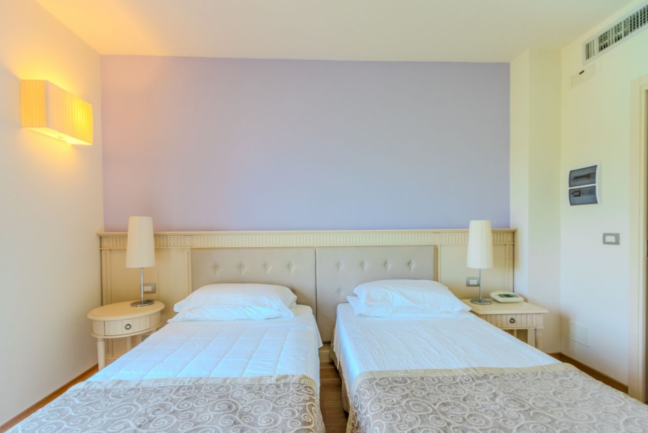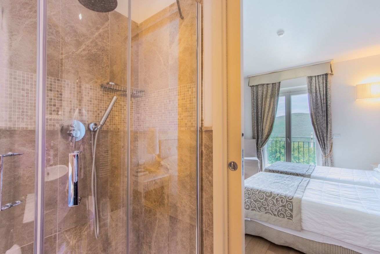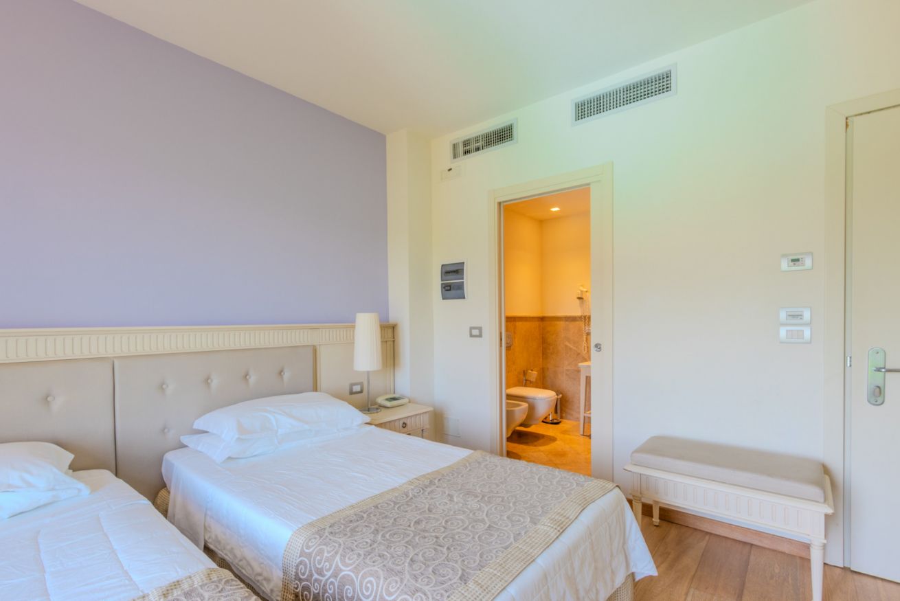 Das 19 m² große Doppelzimmer besteht aus einem Schlafzimmer mit Doppelbett (auf Anfrage auch als zwei Einzelbetten verfügbar) und einem eleganten, privaten Marmorbad mit kompletter Ausstattung und Dusche.