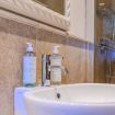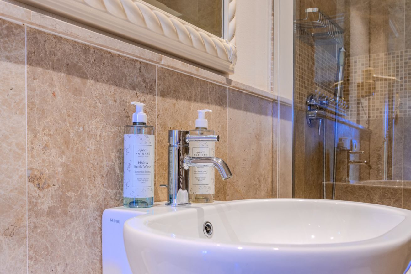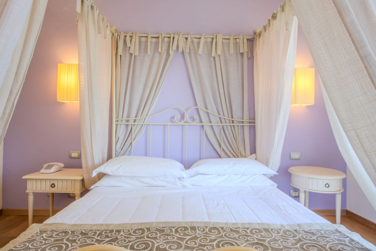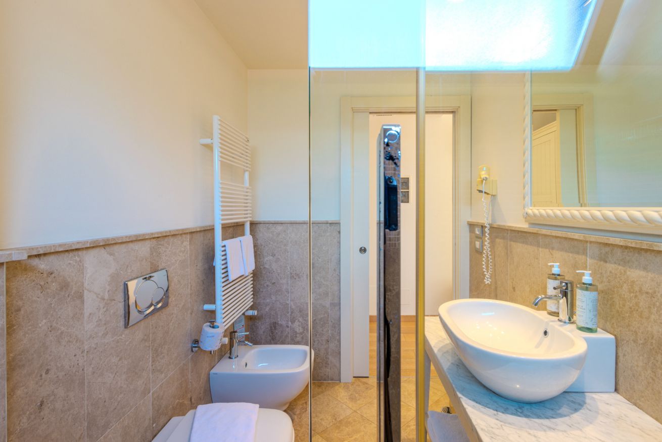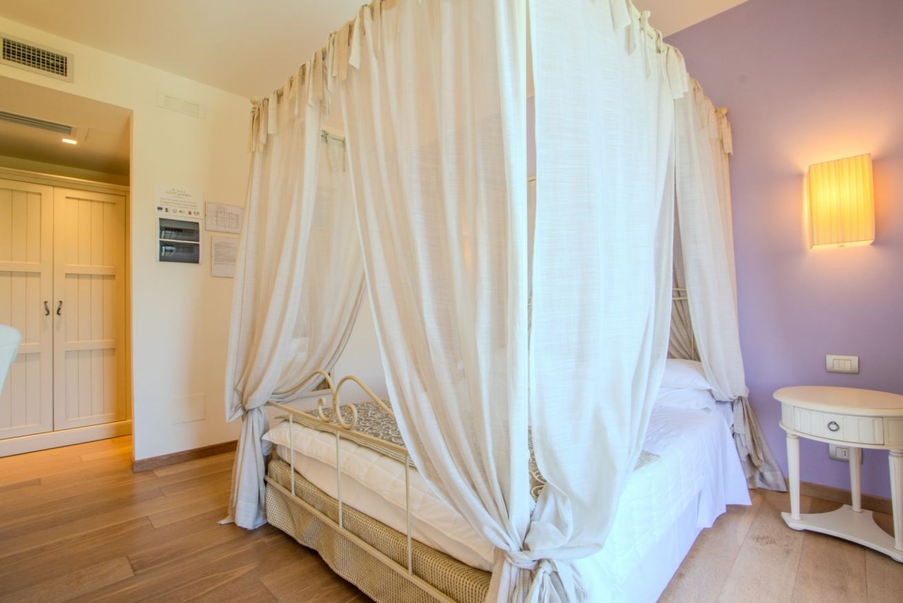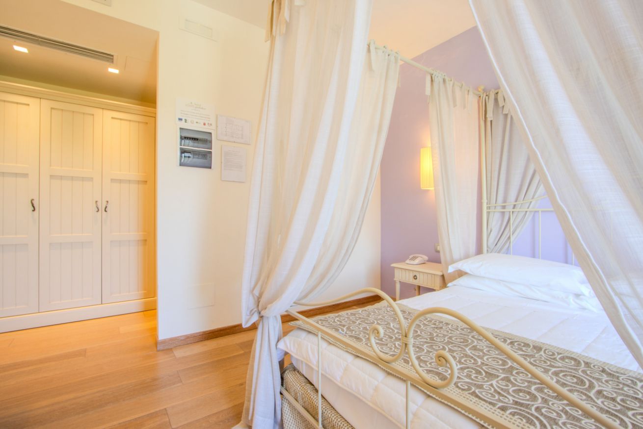 La camera di 22 mq con vista piscina è cosi composta: camera con letto matrimoniale ed un bagno elegante in marmo, privato, completo, non finestrato e con doccia.