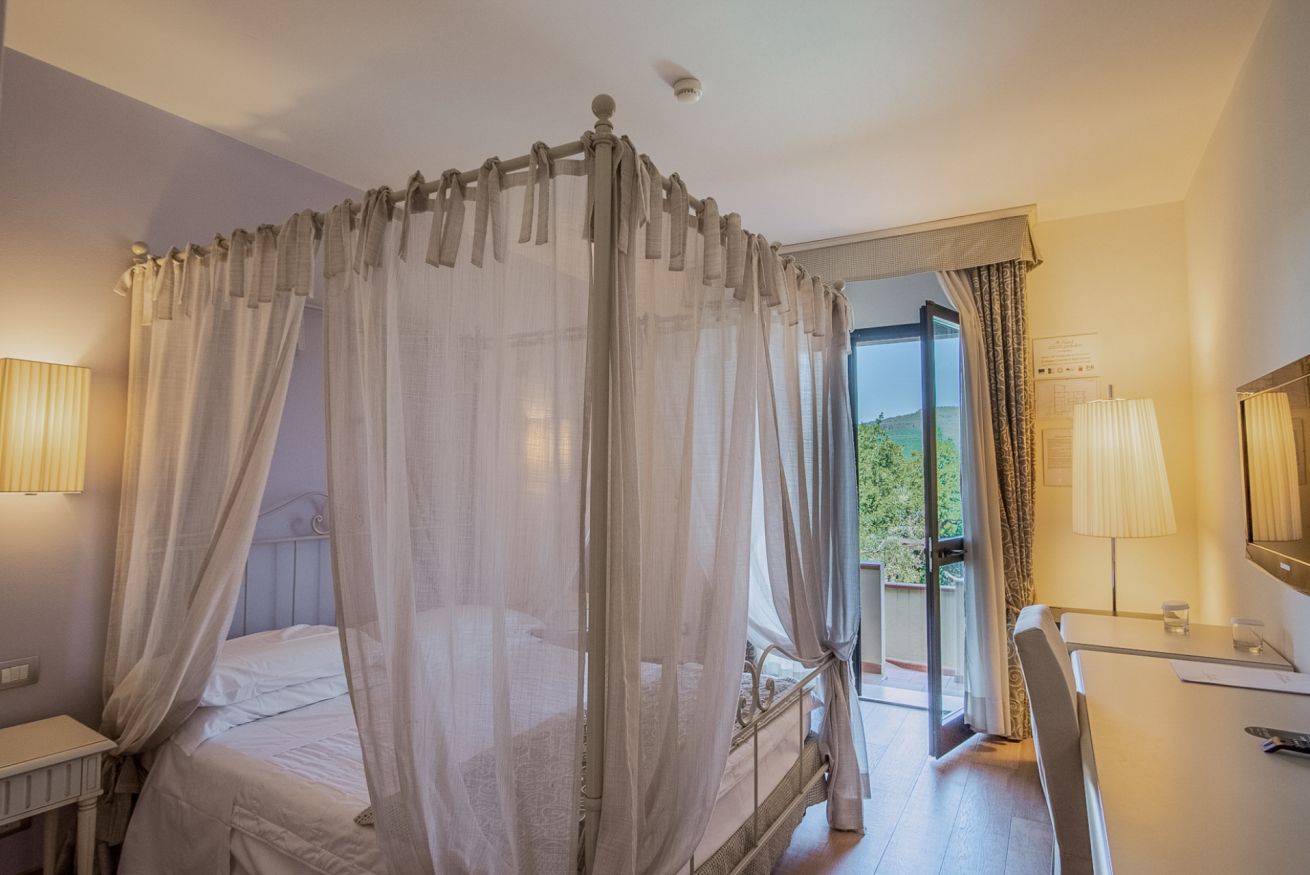 La matrimoniale con balcone privato è dotata di: parcheggio, aria condizionata, riscaldamento, tv in camera, frigobar, bollitore, connessione wi-fi, armadio con grucce, scrivania di lavoro con sedia, set cortesia, asciugacapelli e pavimento in parquet.